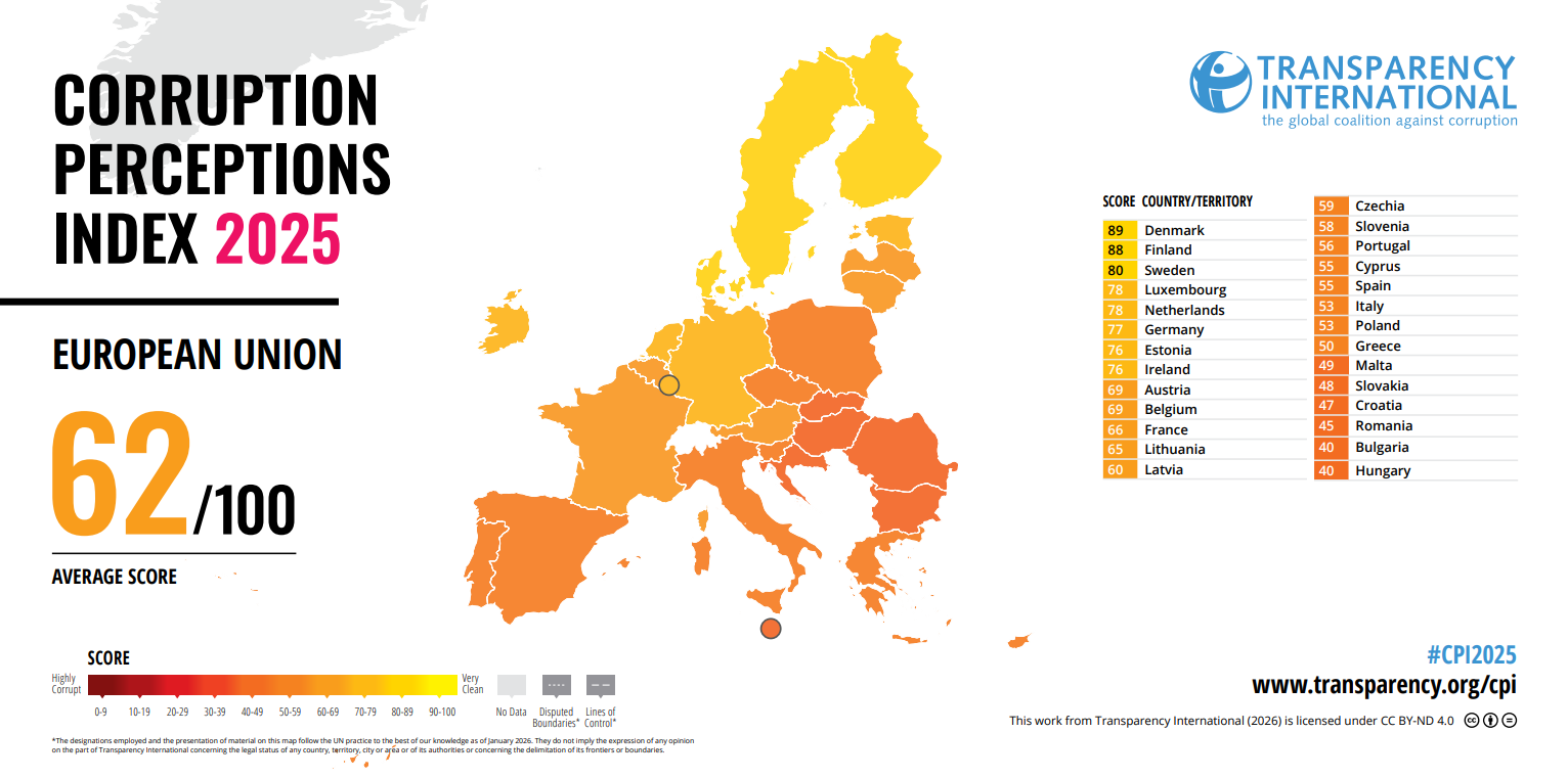 Παρά το γεγονός ότι κατατάσσεται ως η λιγότερο διεφθαρμένη περιοχή παγκοσμίως, η πρόοδος κατά της διαφθοράς στη Δυτική Ευρώπη και την Ευρωπαϊκή Ένωση (ΕΕ) έχει βαλτώσει την τελευταία δεκαετία. Ο μέσος όρος της περιοχής στον Δείκτη Αντίληψης Διαφθοράς (Corruption Perceptions Index – CPI) του 2025 έχει μειωθεί από το 66 στο 64, με 13 χώρες να καταγράφουν σημαντική πτώση και μόλις επτά να σημειώνουν βελτίωση. Το στοιχείο αυτό αναδεικνύει ένα διευρυνόμενο χάσμα μεταξύ των αντικειμενικών προτύπων κατά της διαφθοράς, της εφαρμογής τους και της ακεραιότητας όσων βρίσκονται στην εξουσία.